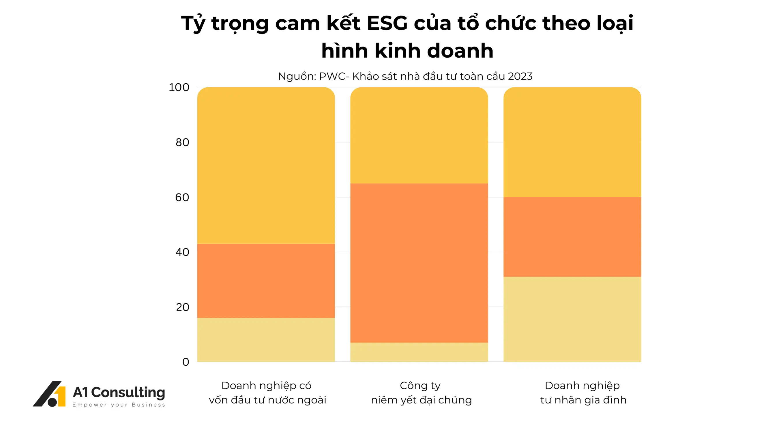 Ngược lại, các công ty niêm yết công khai (PLCs) tại Việt Nam lại thận trọng hơn, với 58% cho biết họ sẽ theo dõi và đánh giá các phát triển ESG trước khi cam kết. Trong khi đó, 40% doanh nghiệp gia đình tư nhân (PFBs) đã thực hiện các cam kết về ESG, cho thấy tinh thần trách nhiệm cao trong lĩnh vực này.