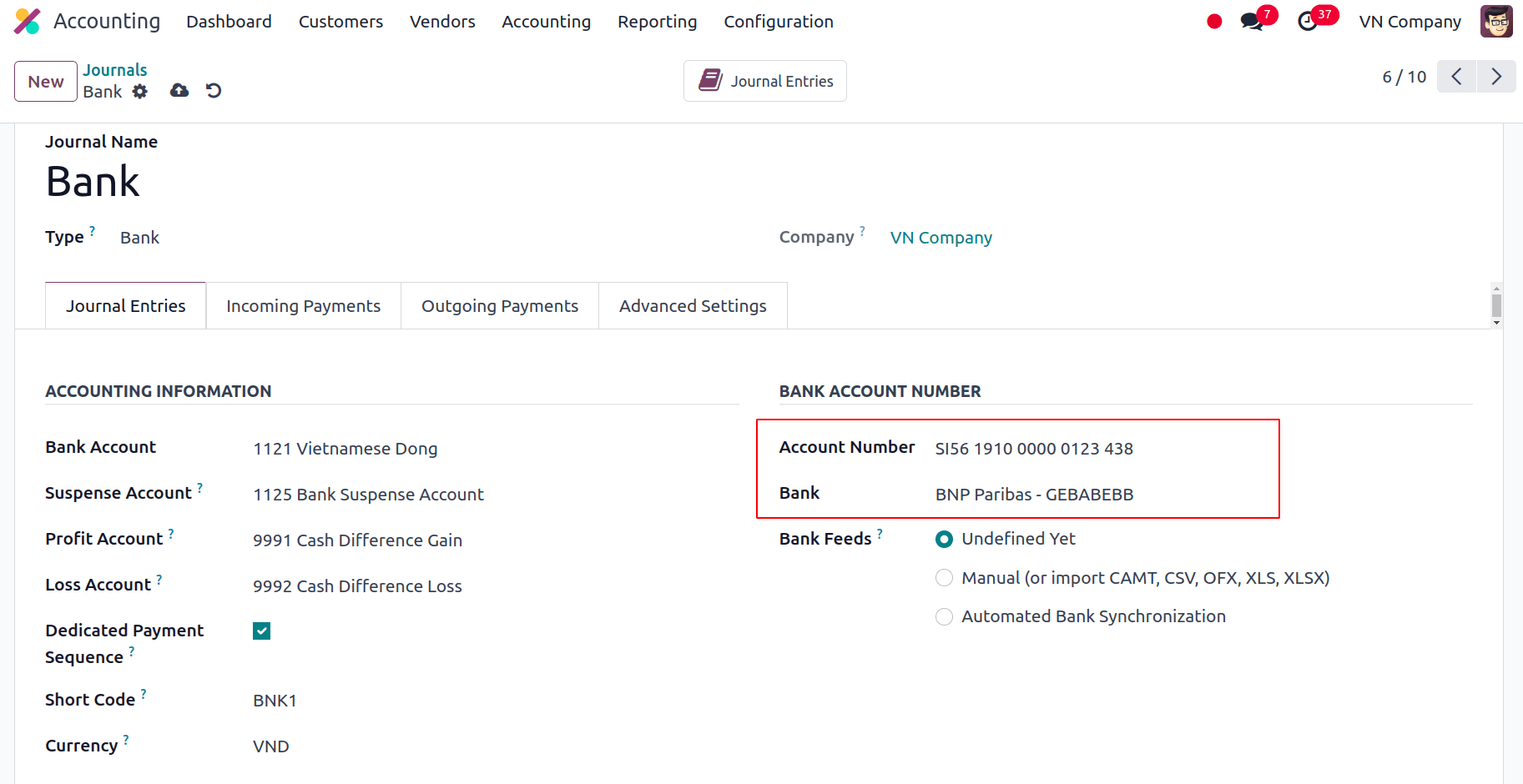 Sau khi cấu hình tài khoản ngân hàng, chúng ta cần cấu hình sổ nhật ký ngân hàng. Để làm điều này, vào Kế toán > Cấu hình > Sổ Nhật Ký (Accounting > Configuration > Journals), sau đó điền Số Tài Khoản và Ngân Hàng vào mục Giao Dịch Nhật Ký (Journal Entries).