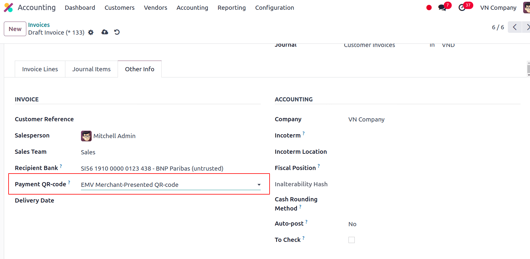 Bây giờ, bạn có thể thêm mã QR ngân hàng Việt Nam vào hóa đơn. Khi tạo một hóa đơn mới, mở tab Thông Tin Khác (Other Info) và chọn Mã QR Do Người Bán Cung Cấp (EMV Merchant-Presented QR-code) trong mục Mã QR Thanh Toán (Payment QR-code).
