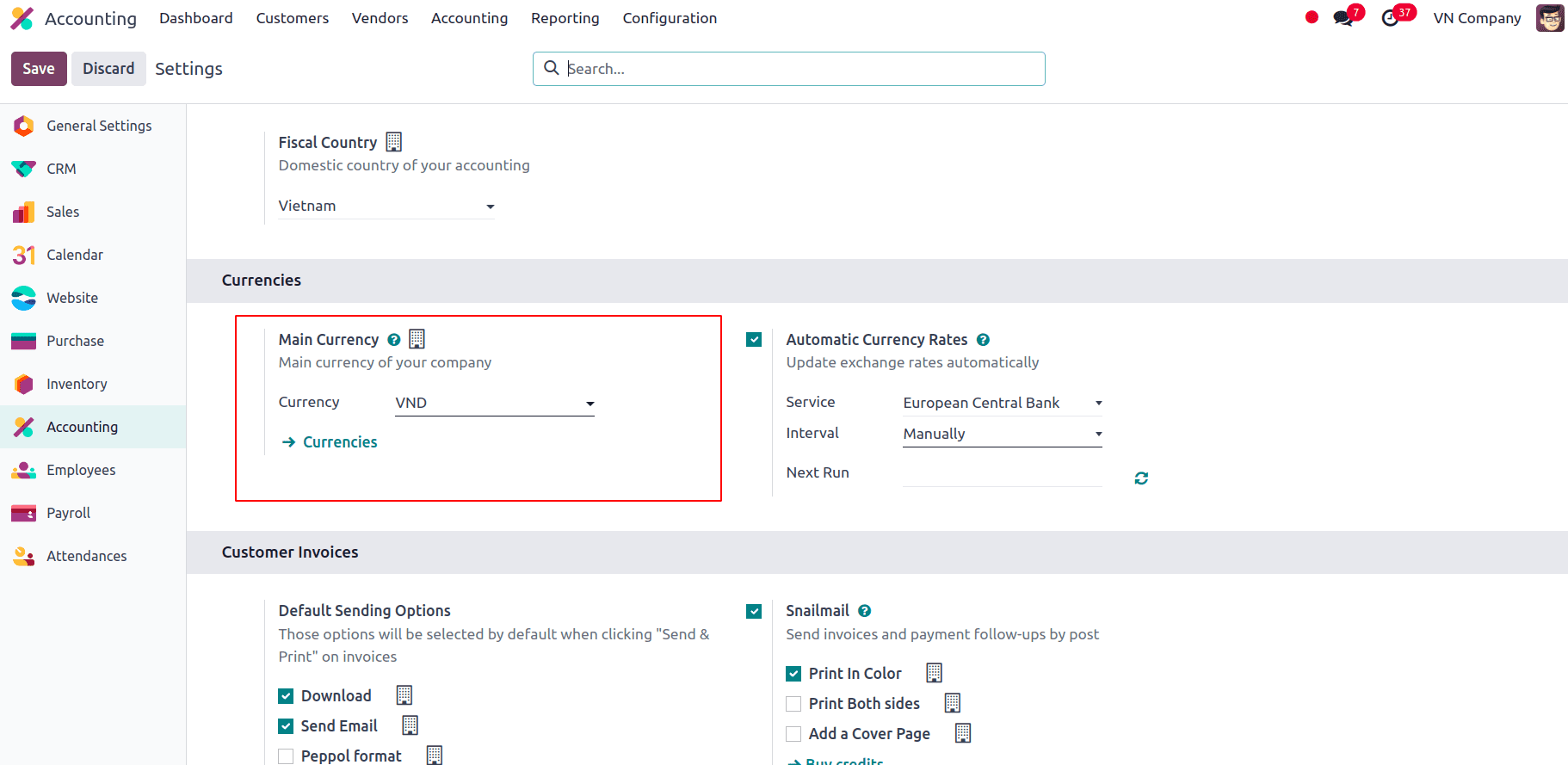 Sau khi cài đặt kế toán cho Việt Nam và đảm bảo thông tin công ty chính xác, bạn có thể vào mục Kế toán > Cấu hình > Cài đặt (Accounting > Configuration > Setting) để kiểm tra các thay đổi. Tại đây, bạn sẽ thấy Việt Nam được chọn làm tài chính mặc định.