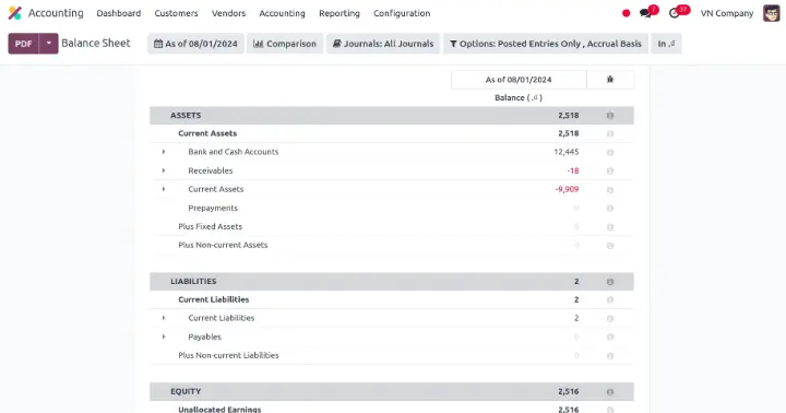 Nợ Phải Trả đại diện cho các khoản nợ và nghĩa vụ mà công ty cần thanh toán, chẳng hạn như vay mượn, các khoản phải trả và chi phí phát sinh. Các nợ ngắn hạn có thể được xem trong mục này. Việc theo dõi và báo cáo chính xác các khoản nợ trong Odoo giúp cung cấp cái nhìn về cam kết tài chính của công ty và khả năng đáp ứng các nghĩa vụ này.