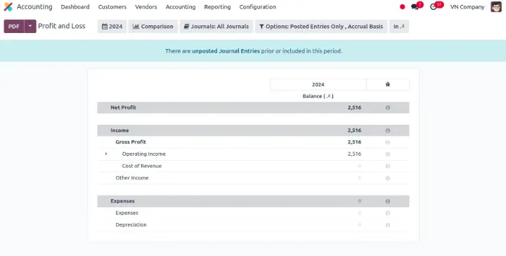 Báo cáo Lãi Lỗ (P&L) trong Odoo cung cấp một cái nhìn tổng quan về hiệu suất tài chính của doanh nghiệp trong một khoảng thời gian nhất định. Báo cáo này giúp nắm bắt thông tin về doanh thu và hiệu quả hoạt động của công ty thông qua việc phân tích doanh thu, chi phí và lợi nhuận hoặc lỗ.