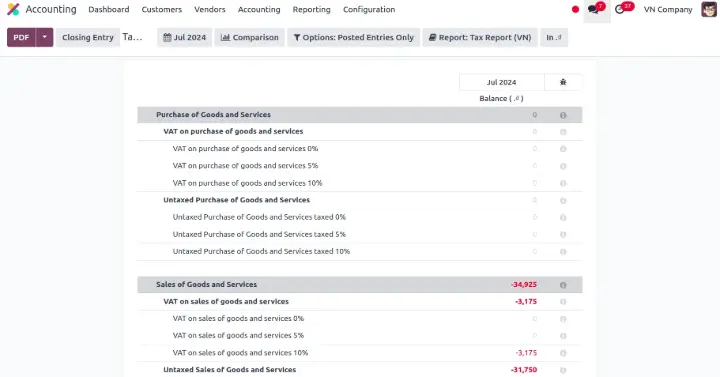 Báo cáo thuế cũng hỗ trợ doanh nghiệp tạo ra các tài liệu cần thiết cho cơ quan thuế, đơn giản hóa quá trình nộp thuế và đảm bảo tuân thủ các quy định thuế địa phương. Với định vị thuế Việt Nam trong Odoo, việc quản lý thuế trở nên dễ dàng hơn, giảm thiểu rủi ro sai sót và hỗ trợ việc tuân thủ quy định pháp lý hiệu quả nhờ vào việc tự động hóa các hoạt động này.