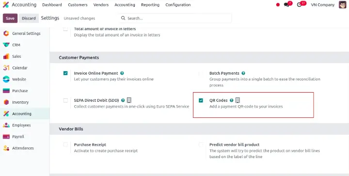 Với mã QR ngân hàng Việt Nam, người dùng có thể sử dụng dịch vụ ngân hàng trực tuyến và di động để chuyển tiền trong nước ngay lập tức đến các cá nhân và doanh nghiệp bằng Đồng Việt Nam. Để thực hiện điều này, chúng ta có thể thêm mã QR vào hóa đơn. Để làm điều này, vào Kế Toán > Cấu Hình > Cài Đặt (Accounting > Configuration > Settings), sau đó trong phần Thanh toán của Khách Hàng (Customer Payments), bạn sẽ thấy tùy chọn Mã QR. Chỉ cần bật tính năng này và nhấn Save để áp dụng.
