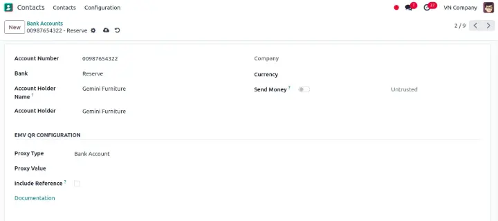 Sau khi bật tính năng mã QR trên hóa đơn, chúng ta cần cấu hình tài khoản ngân hàng với cấu hình QR banking. Để làm điều này, vào module Liên hệ (Contacts) và chọn tài khoản ngân hàng mà bạn muốn kích hoạt dịch vụ QR banking Việt Nam. Tiếp theo, vào Cấu hình > Tài Khoản Ngân Hàng (Configuration > Bank Accounts). Tại đây, bạn cần nhập Mã định danh Ngân Hàng (Bank Identifier Code) của ngân hàng. Sau đó, chọn Loại Proxy và điền Giá trị Proxy theo lựa chọn của bạn. Ngoài ra, cần chắc chắn rằng quốc gia của chủ tài khoản được thiết lập là Việt Nam.