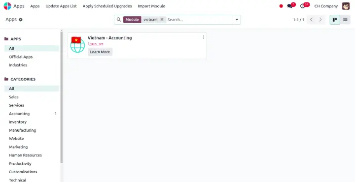 Mô-đun kế toán Việt Nam của Odoo 18 giúp tuân thủ các quy định về thuế và kế toán một cách đơn giản hơn. Cài đặt mô-đun này là bước đầu tiên cần phải thực hiện. Người dùng có thể vào tìm thấy mô-đun này trong mục Ứng dụng.