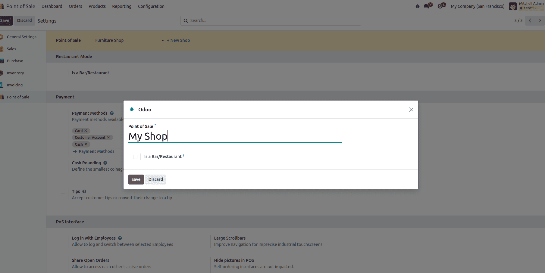 Khi bạn nhấn vào New Shop, Odoo sẽ mở ra một trình hướng dẫn cấu hình, tại đây bạn có thể: