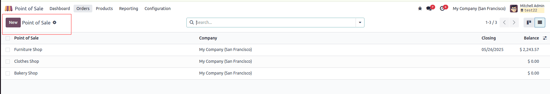 Từ POS Dashboard (bảng điều khiển POS), nhấp vào New Session (Bắt đầu phiên mới) trong danh sách các cửa hàng để khởi động một phiên bán hàng.