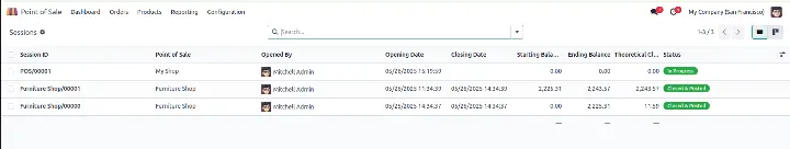 Bạn có thể theo dõi các phiên bán hàng thông qua tab Orders > Sessions (Đơn hàng > Phiên bán hàng). Tại đây, hệ thống sẽ mở lại POS Dashboard và hiển thị danh sách các phiên đang hoạt động cùng thông tin chi tiết liên quan.