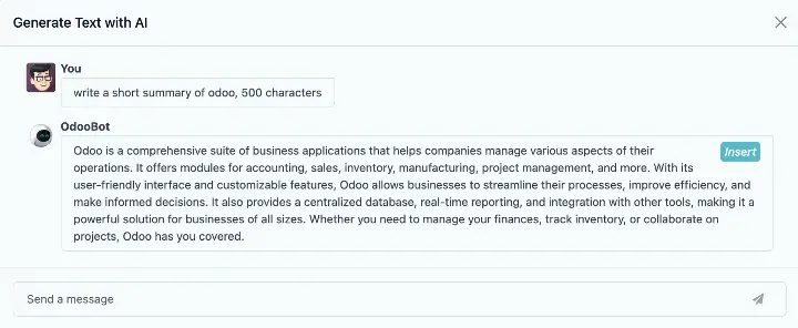 Trợ lý soạn thảo tích hợp sẵn, dùng ChatGPT để nháp, tinh chỉnh hoặc viết lại văn bản trong nhiều module, dựa trên ngữ cảnh thời gian thực của bản ghi. Khả dụng từ Odoo 17+ trong CRM, Marketing, Knowledge, Website.