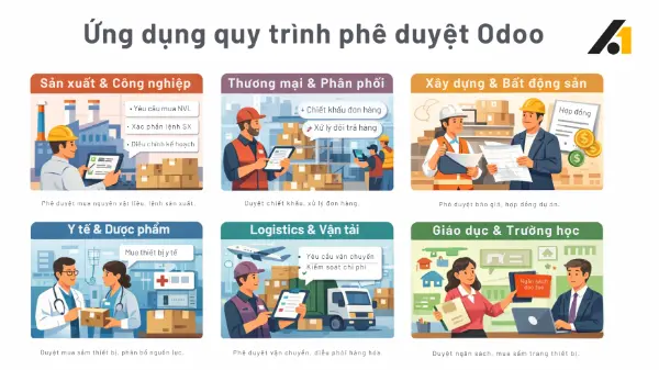 Một trong những điểm mạnh lớn nhất của Odoo Approvals là khả năng thích ứng với nhiều ngành nghề khác nhau, từ sản xuất, thương mại đến các lĩnh vực có tính đặc thù cao như y tế hay giáo dục. Thay vì áp dụng một mô hình phê duyệt cứng nhắc, Odoo cho phép doanh nghiệp thiết kế quy trình phù hợp với từng bối cảnh vận hành cụ thể.