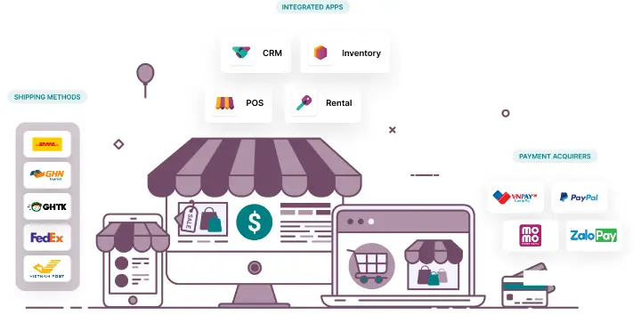 Odoo hỗ trợ kết nối toàn bộ các kênh bán hàng như cửa hàng, website, sàn TMĐT và mạng xã hội vào một nền tảng duy nhất. Điều này giúp doanh nghiệp đồng bộ dữ liệu kho hàng, đơn hàng và khách hàng theo thời gian thực, tránh sai sót và tăng trải nghiệm mua sắm liền mạch cho người tiêu dùng.