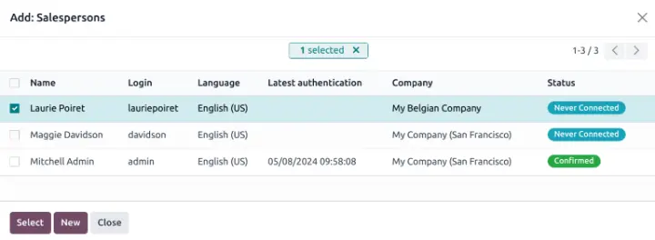 - Chọn một người dùng từ danh sách thả xuống Nhân viên bán hàng (Salesperson) để thêm họ vào nhóm.