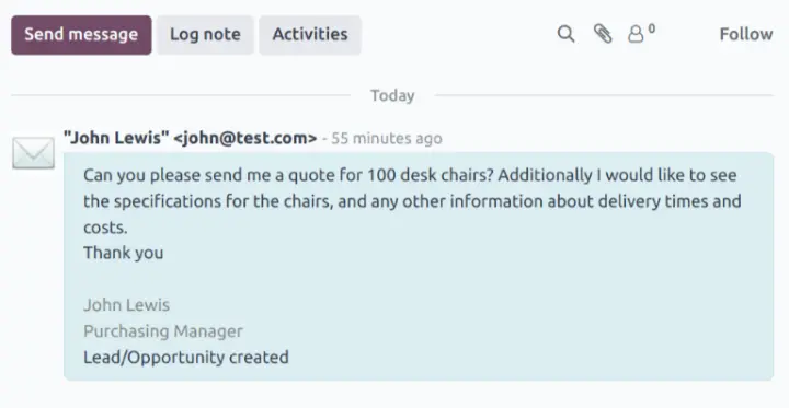 Khi có email được gửi đến địa chỉ email alias của nhóm bán hàng, Odoo sẽ tự động tạo một lead mới từ nội dung email đó.