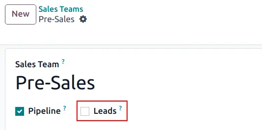 Trước tiên bạn truy cập ứng dụng CRM → Cấu hình (Configuration) → Nhóm bán hàng (Sales Teams. Chọn nhóm bán hàng bạn muốn thiết lập, để mở trang chi tiết cấu hình.