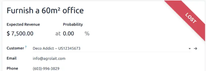 Để đánh dấu một lead là đã mất, vào CRM app ‣ Leads, sau đó chọn một lead từ danh sách. Thao tác này sẽ mở form chi tiết của lead. Tiếp theo, nhấp vào nút Lost ở phía trên form chi tiết của lead.