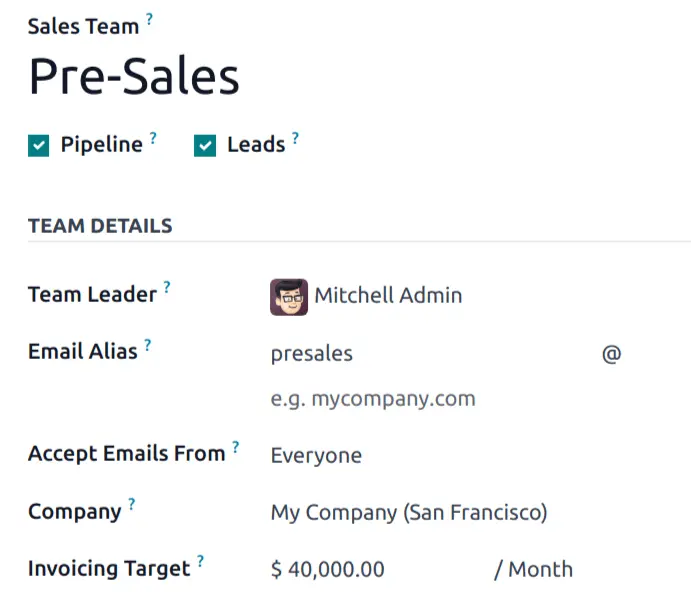 Trong Odoo CRM, mỗi nhóm bán hàng có thể thiết lập địa chỉ email alias riêng. Khi có email gửi đến địa chỉ này, hệ thống sẽ tự động tạo lead (hoặc cơ hội bán hàng) từ nội dung email nhận được.
