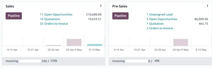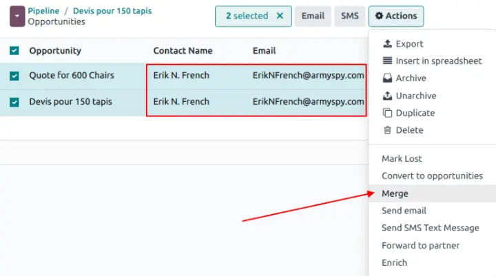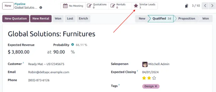 Để so sánh chi tiết của các Lead/Opportunity tương tự, hãy điều hướng đến ứng dụng CRM ‣ Pipeline hoặc CRM ‣ Leads.