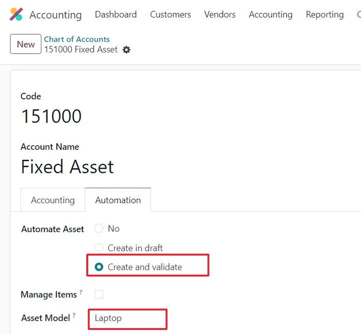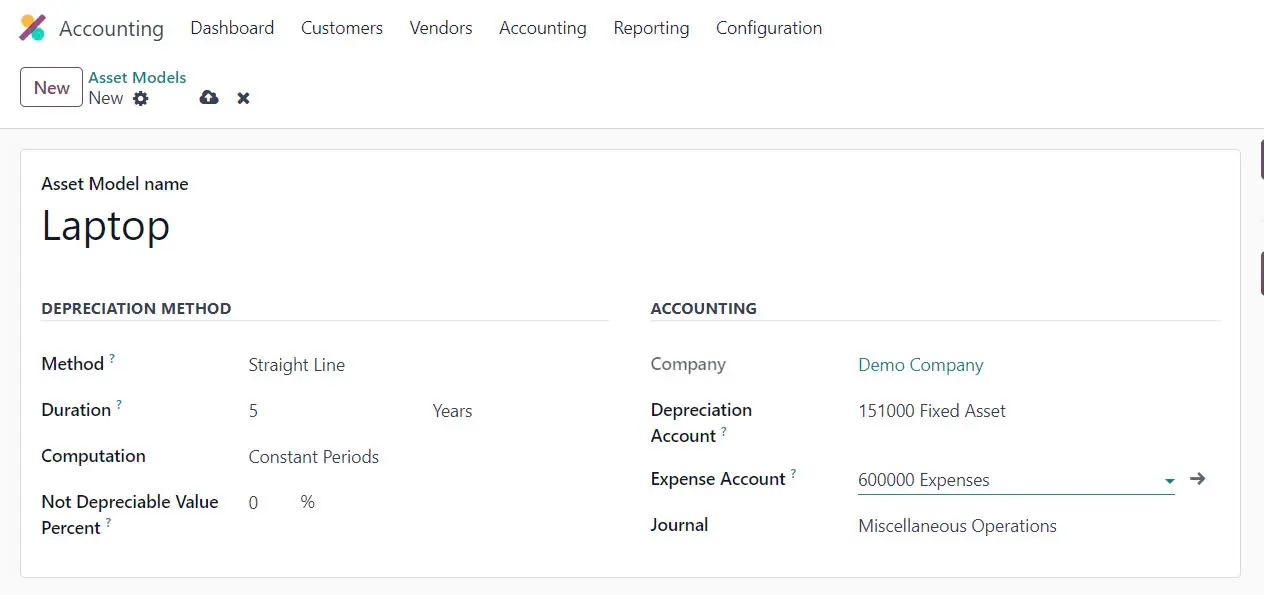 Khi tạo một mô hình tài sản, người dùng cần chỉ định tên, thời gian khấu hao, phương pháp khấu hao (tức là khấu hao giảm dần, đường thẳng hoặc kết hợp) và thông tin kế toán. Điều này bao gồm việc cấu hình các tài khoản chi phí, tài khoản khấu hao và tài khoản mua tài sản. Ngoài ra cũng cũng cần quyết định cách tính khấu hao theo thời gian (tức là phân bổ đều hoặc dựa trên các giai đoạn cụ thể).