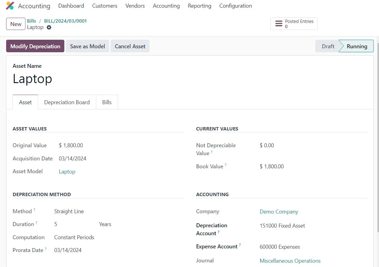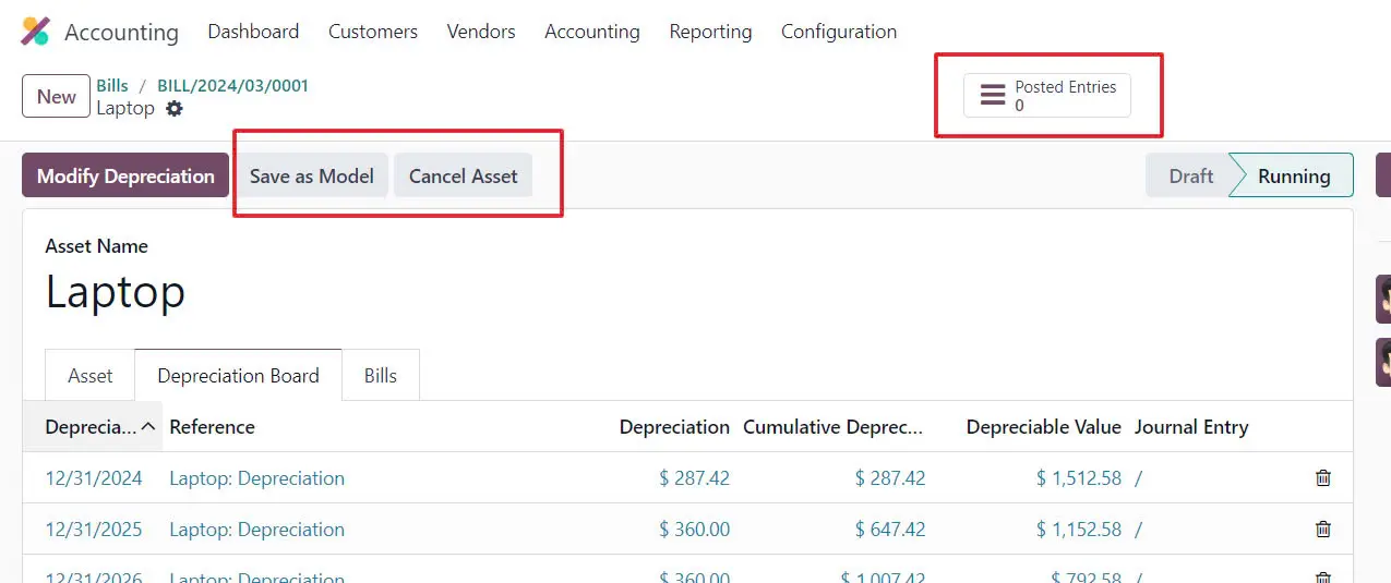 Bạn có thể kiểm tra các bút toán đã ghi nhận bằng cách nhấp vào Posted Entries, hoặc lưu tài sản dưới dạng một mẫu tài sản bằng cách chọn Saving the asset as a model, hoặc hủy bỏ bằng cách chọn Cancelling it.