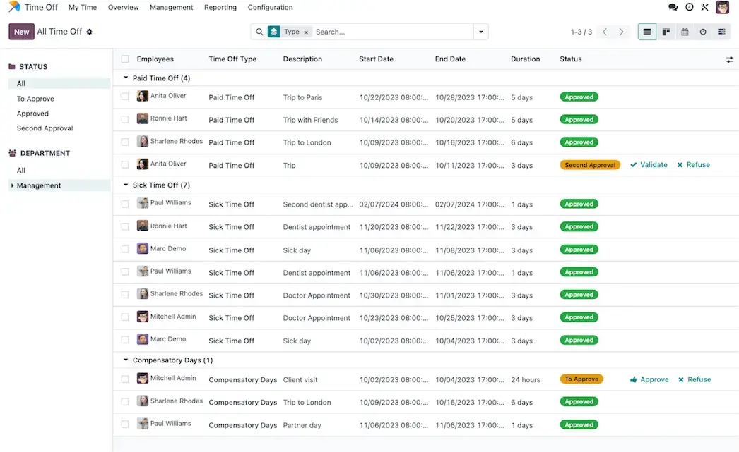 Thông qua các phân hệ như Time Off, Payroll, và HR trong phần mềm quản lý trường học Odoo, nhà trường có thể: