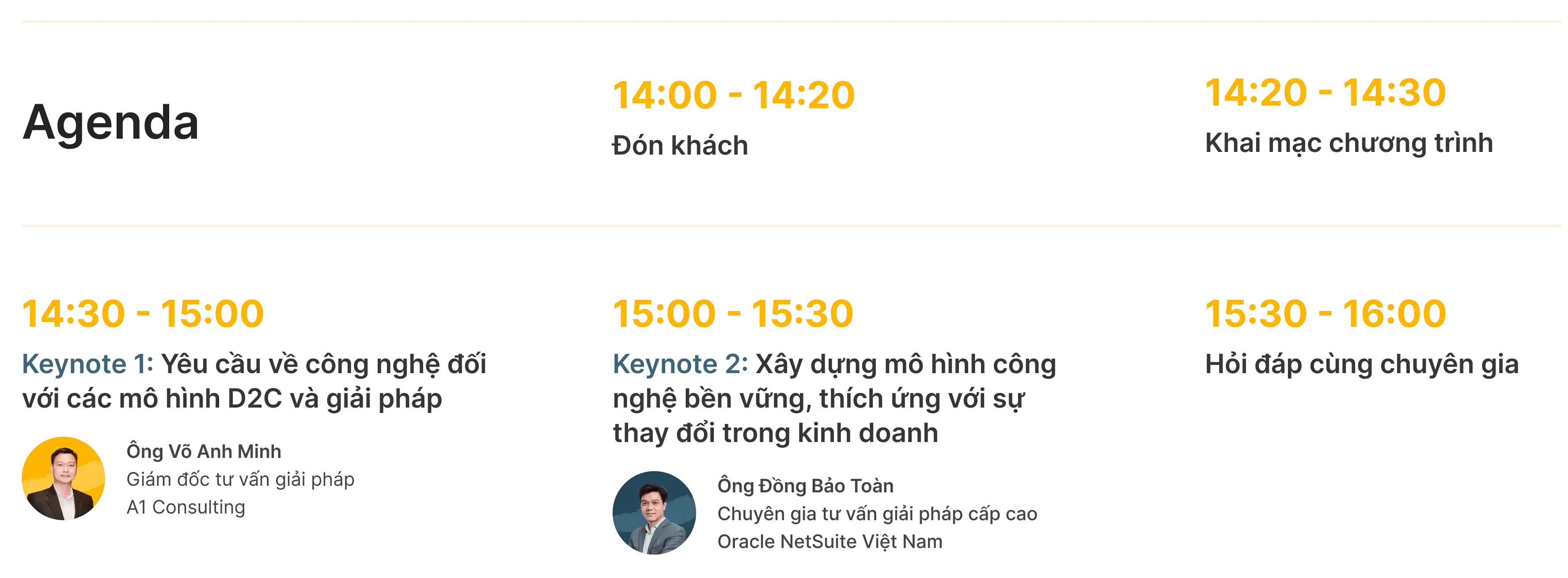 Thấu hiểu những khó khăn đó, A1 Consulting cùng Oracle Netsuite phối hợp tổ chức chuỗi hoạt động ERP Roadshow: Chiến lược công nghệ cho mô hình D2C đối với các doanh nghiệp sản xuất. Sự kiện mong muốn sẽ giúp các doanh nghiệp sản xuất định hình được chiến lược đầu tư và cải thiện hạ tầng công nghệ để bắt kịp và tận dụng D2C hiệu quả.