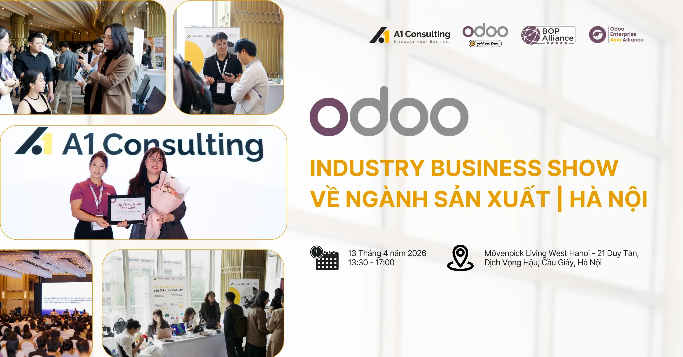 A1 Consulting tự hào là nhà tài trợ chính của sự kiện Odoo Industry Business Show về Sản Xuất 2026 – nơi quy tụ các doanh nghiệp sản xuất đang tìm kiếm giải pháp chuyển đổi số hiệu quả, linh hoạt và sẵn sàng cho tăng trưởng dài hạn.